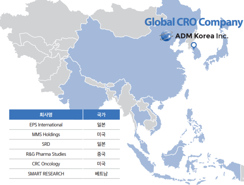 임상시험을 전문으로 진행하려면 다양한 데이터가 오랜기간 축적되어있어야 시간 대비 효율적인 업무를 수행할 수 있는데 에이디엠 코리아는 2003년 설립 이후 꾸준히 성장해 온 것으로 보인다. 대형 제약회사들을 보유하고 있다고 했으나 어떤 제약사인지는 자세히 밝혀져 있지는 않아서 아쉽다. 글로벌 회사로 도약하기 위해 베트남 1위 CRO를 관계사로 편입하거나 태국 지사 설립 등의 모습을 보여왔으며 앞으로 아시아 10개 지역에 추가로 임상수행 인프라 구축 계획을 가지고 있다.