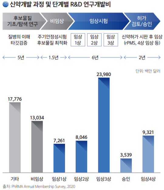 즉 제약회사에서 신약개발 과정 중 임상시험 단계 비용이 많이 들기 때문에 전문으로 하는 CRO에 일을 의뢰하여 진행한다. 신약개발 과정 중에서도 임상시험 부분만 1상 2상 3상으로 단계가 나눠진다. 임상CRO에서 주요 매출이 많이 발생하고 그중에서 연구개발 비용이 가장 많이 들기 때문에 임상 3상에서 매출을 가장 많이 발생 시키는 요인 임을 확인할 수 있다.