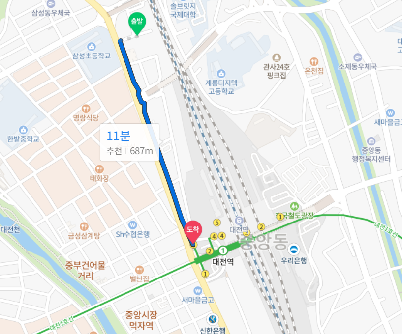 지도상 거리를 보면 대전1호선, KTX 대전역까지 거리가 가깝다. 실제 도보로 확인해보니 10분이 넘는 거리라서 역세권이라고 하기 애매한 거리이다. 10분 이내 거리는 아니지만 주변 상권으로 생활권은 역세권으로 볼 수 있을 것이다. 대중교통으로 대전 내부는 1호선을 타고 이동하고 타지방으로는 KTX를 타고 이동하기 좋은 환경을 가지고 있어 교통이 아주 좋다. 자차를 이용할 경우 8분 소요하여 대전 IC를 통해서 경부고속도로를 이용할 수 있고 대전 외곽이나 타지방 이동이 수월한 구조를 가지고 있다.