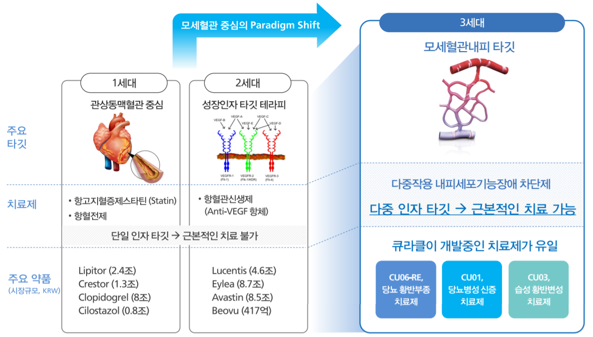큐라클의 주요 기술은 솔바디스(SOLVADYS) 플랫폼 기술로 혈관내피기능 차단이 가능하다. 모세혈관 내피에서 다중 세포기반 스크리닝, 스마트 효능 분석, 최적화된 적응증 개발, 타깃 및 기전분석, 스마트 설계와 합성 과정을 거치며 내피세포기능장애 요인을 차단시켜버린다. SOLVADYS 플랫폼 기술을 이용해서 CU06-RE인 당뇨 황반부종 치료제와 CU01인 당뇨병성 신증 치료제 그리고 CU03인 습성 황반변성 치료제 등을 개발 중이다. 간단하게 요약하면 모세혈관 장애로부터 시작하는 병에서 원인이 되는 요인을 파악하여 유전자 변형을 통한 치료제를 개발할 수 있는 플랫폼인 SOLVADYS가 핵심기술로 보인다.