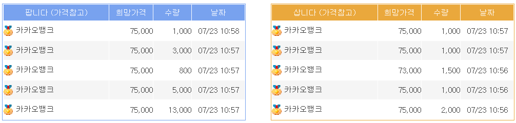 최근 코스피 상장 예정인 종목들이 높은 공모가 논란으로 가격을 조금씩 낮추고 있는 가운데 사람들의 관심도가 집중되어있는 7월 두 번째 코스피 청약을 진행하는 카카오 뱅크에 대해 살펴보자. 업종은 은행 및 저축기관이며 주요 제품은 은행 및 금융서비스이고 주관사는 KB증권, 한국투자증권, 하나금융투자, 현대차 증권이다. 수요예측 결과 기관경쟁률은 1,732:1이며 확정공모가는 공모밴드 33,000원~ 39,000원에서 최상단인 39,000원이다. 이번 청약에서 균등배정을 받으려면 최소청약금 195,000원은 필요하다.