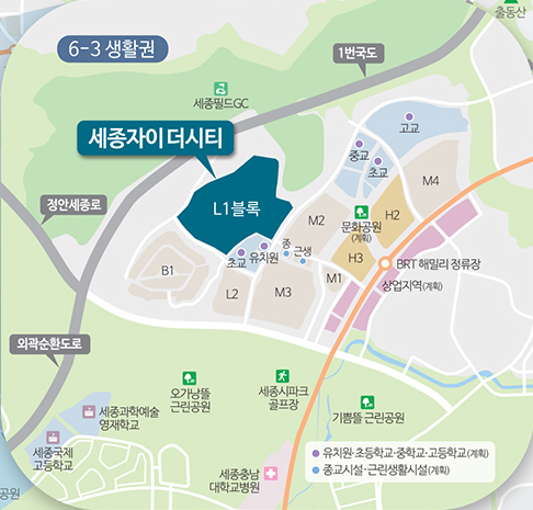주변상권으로 대형마트는 홈플러스(세종점)가 자차 9분 거리에 있으며 종합병원은 자차 5분 거리에 세종충남대학교 병원이 있어서 이용하기 수월하다. 근린공원으로 오가낭뜰근린공원, 기쁨뜰근린공원이 있어서 산책 하기 좋은 환경이다. 교육환경은 현재 해밀 초중고교는 도보 15분 거리에 있기 때문에 거리가 좀 있는 편이며 단지 내 교육시설이 계획되어 있어서 기대를 가지면 될 것이다. 그리고 세종 국제고교, 세종 과학예술영재학교 등 우수한 학교가 가까운 곳에 있다.