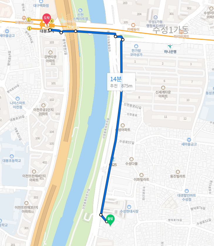 가까운 전철역은 대구 3호선 대봉교역이며 도보로 14분 정도 소요되어 걷기에는 조금 거리가 있다. 3호선 라인은 서대구공단 쪽 이동에 적합하여 이동이 좋아 보인다. 그러나 대구 3호선에서 2호선으로 환승하려면 조금 돌아가야 하기 때문에 버스를 수성구청 쪽으로 가려면 버스를 이용하는 쪽이 나아 보인다. 자차를 이용하면 수성구 내부 이동이 가장 수월하며 타 지역으로 이동시 신천을 따라나가서 10분 정도 소요하여 북대구 IC를 통해서 경부고속도로를 이용하면 된다.