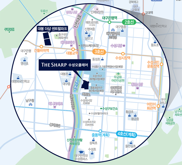 주변 상권으로 대형마트는 자차 10분 이내 거리에 이랜드리테일(동아마트 수성점), 홈플러스(대구 수성점), 이랜드리테일(동아 쇼핑점), 현대백화점(대구점), 롯데 영플라자(대구점), 이랜드리테일(동아 본점)이 있다. 종합병원은 자차 10분 이내 거리에 경북대학교 병원, 영남대학교 병원을 이용할 수 있다. 근린공원으로 단지 내 공원이나, 바로 앞 신천 있어서 천을 따라서 걷기 좋은 코스가 될 것이다. 교육환경으로 도보권에 대구동성초등학교와 가까운 거리에 신명여자중학교, 황금중학교, 대구과학고등학교가 있어서 좋은 편이다.