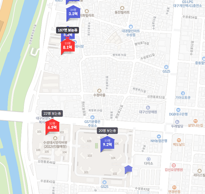 더샵 수성 오클레어 분양가는 50형 4억 85형 8.1억으로 가격이 높은 편이다. 주변 시세를 보면 22년 3월 입주예정인 수성 데시앙 리버뷰는 84형 6.5억이고 2년 차 수성 효성해링턴 플레이스 84형 9.2억이다. 신축 아파트 실거래가를 보면 적당한 가격으로 보이나 브랜드 소형단지 아파트를 감안해서 최근에 청약을 진행한 아파트들 30평대는 6억 선이라 가격 경쟁력에서 조금 밀리는 것으로 보인다. 주변 단지 실거래가를 보면 프리미엄을 기대할 수는 있겠으나 그 폭이 매우 적게 느껴지기 때문에 현재 청약이 계속 진행되는 가운데 6억대 아파트를 매매하는 것이 더 낫겠다고 판단하는 분들이 있어서 미계약분이 절반 정도 나온 것으로 추측된다.