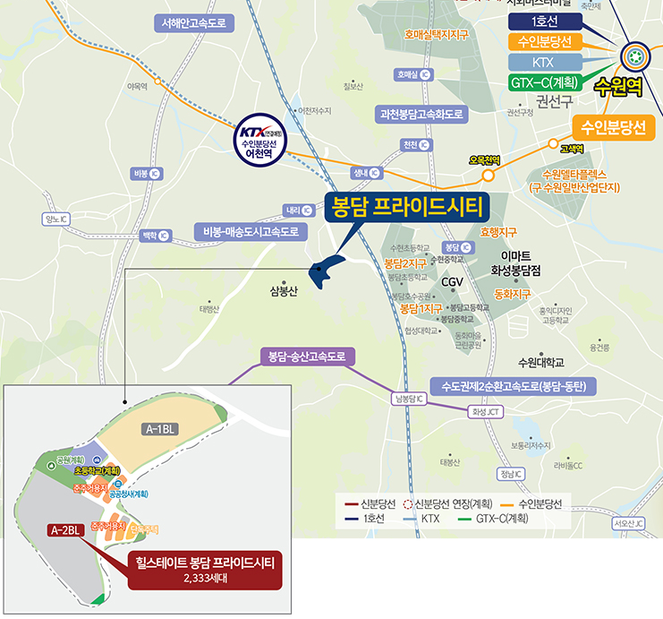 신분당선 연장 호재로 인기가 높은 화성시 봉담에서 분양을 진행하는 힐스테이트 봉담 프라이드 시티에 대해 살펴보자. 공급 위치는 경기도 화성시 봉담 내리지구 A2BL이며 공급규모는 특별공급 1,164세대 일반공급 1,169세대 총공급 2,333세대이고 입주시기는 2024년 8월 예정이다. 이전에 A1블럭 청약을 진행했었고 건설사는 다르지만 이번 대규모 단지 분양을 진행하면 총 4천 세대가 내리 지구에 입주하게 된다.