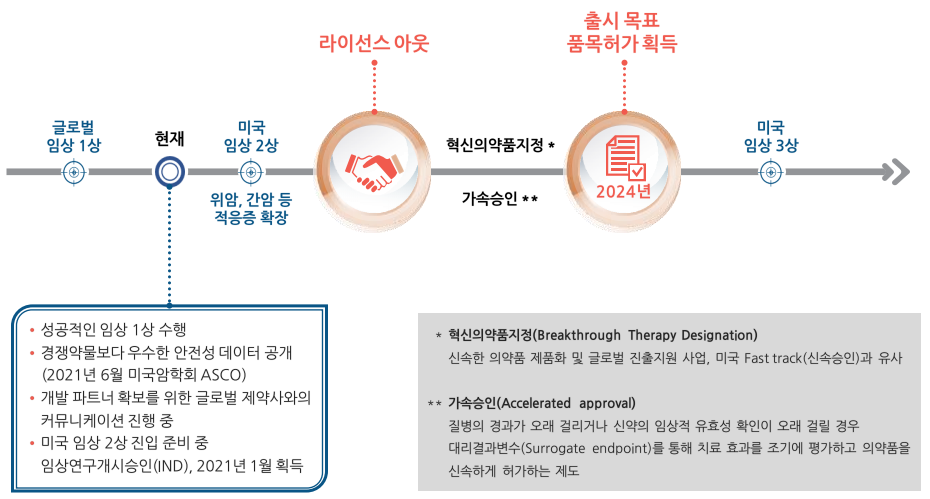 에이비온의 표적항암치료제는 암의 원인이 되는 특정 요인을 미리 예측하여 약물을 투여한다. 이 기술에 중요한 점은 부작용을 줄여주는 안정성이 필요하지만 신약개발에 대한 확장성을 높여주고 의료환경개선과 의료비 절감에 대한 기대가 있다. 연구개발이 가장 많이 진행되어 대표 제품인 ABN 401은 폐암 위암을 대상으로 하는 표적 항암제이며 21년 글로벌 임상 1상 완료하고 미국 FDA 2상 진입 예정이다. 이후 출시 목표로 품목허가 획득을 2024년으로 계획하고 있다.