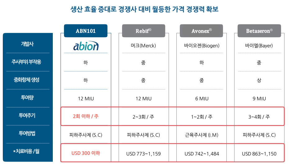 다발성경화증 및 바이러스성 감염병 치료제인 ABN101은 중추신경계 질환, 호흡기바이러스 질환, 다발성 경화증 암, 코로나 같은 바이러스성 질환, 기타 자가면역질환으로 적응증으로 치료제 개발이 가능하다. 그리고 2019년 8월 삼성 바이오로직스와 ABN101 위탁개발 생산 계약(CDMO)을 체결하여 기존 ABN101에 비해 생산성, 용해도, 안정성, 약동성, 유효성을 개선하고 21년 4분기 글로벌 임상 진입을 목표로 하고 있다.