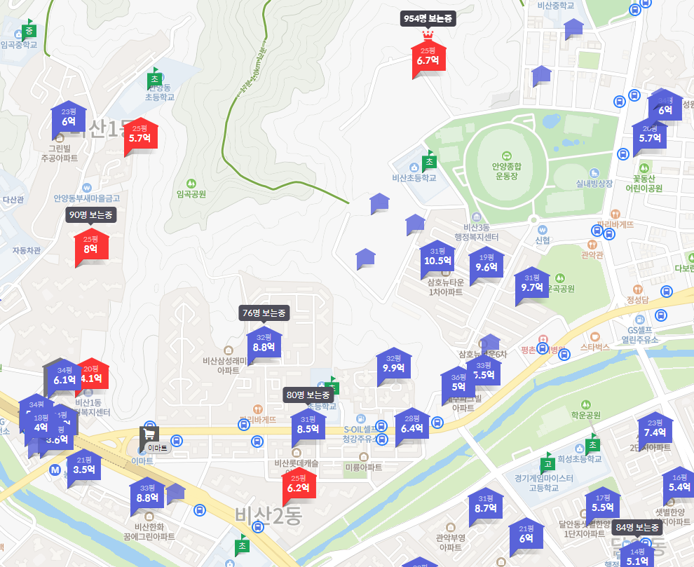 엘프라우드 분양가는 21평 5.5억 24평 6.7억이고 최근 분양 진행했던 근처 단지들을 보면 23년 5월 입주 비산 한신 더휴 24평 5억, 22년 1월 입주 평촌 자이 아이파크 25평 입주권 8억, 21년 11월 입주 평촌 래미안 푸르지오 25평 입주권 6.2억이지만 현 상황에 매물이 거의 없는 상황이라 분양가로 판단하기 힘들다. 그래서 주변 10년 차 이하 아파트 보면 이미 24평 8억대 이상 형성되어 무조건 안전마진이 있는 분양가로 보인다. 안양지역 아파트 분양 경쟁률은 치열하겠지만 계약금만 있다면 무조건 청약을 시도해 보는 것이 좋겠다.