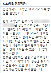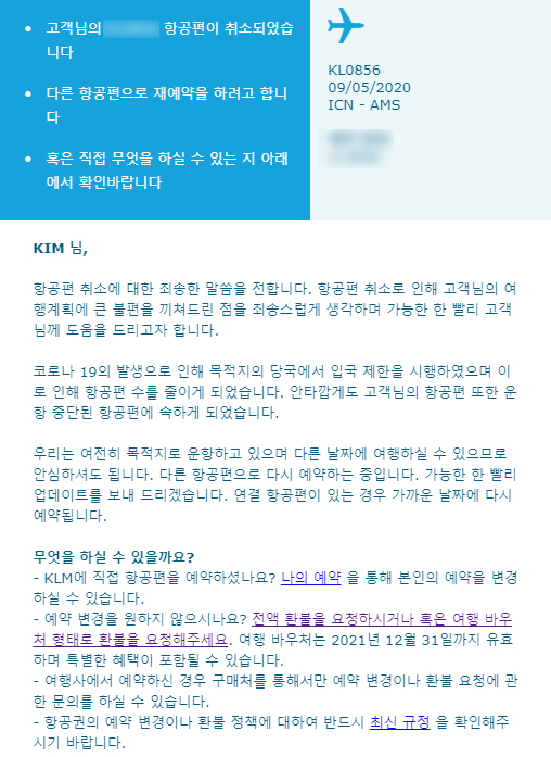 며칠 뒤 메일 한통이 왔다. 우리가 타고 가는 비행 운항 취소되었다는 내용이었다. 유럽 입국이 가능해져서 운항은 하게 되었지만 일정은 많이 줄어들었는데 그중에 우리 항공편도 속하게 되어서 안도를 하게 되었다. 메일 내용은 다른 예약을 잡거나 환불신청을 하는 것이었다. 고민할 것도 없이 환불신청 방법을 알아보고 신청을 진행했다. 신청방법은 검색하면 쉽게 나와 있었다.