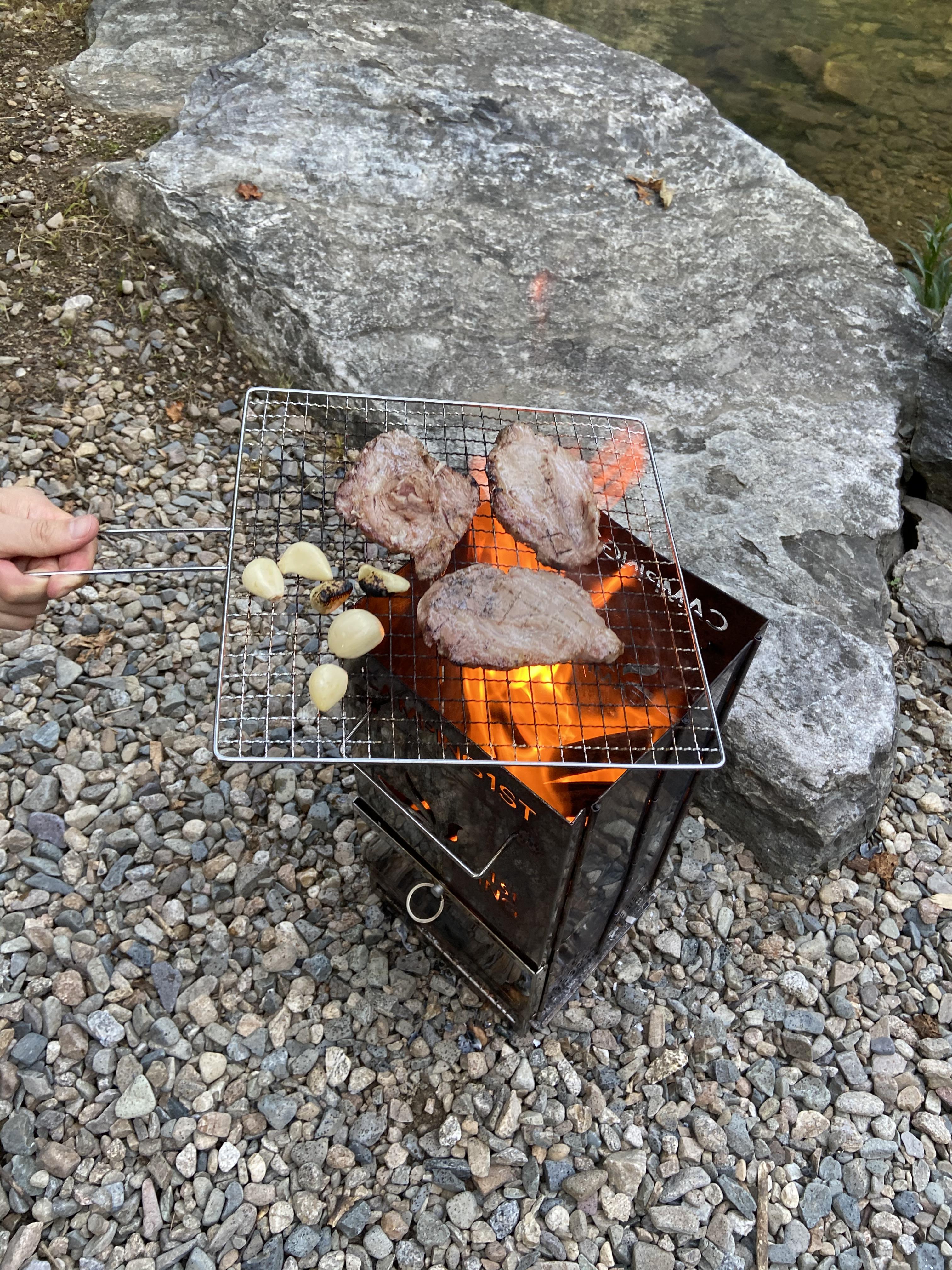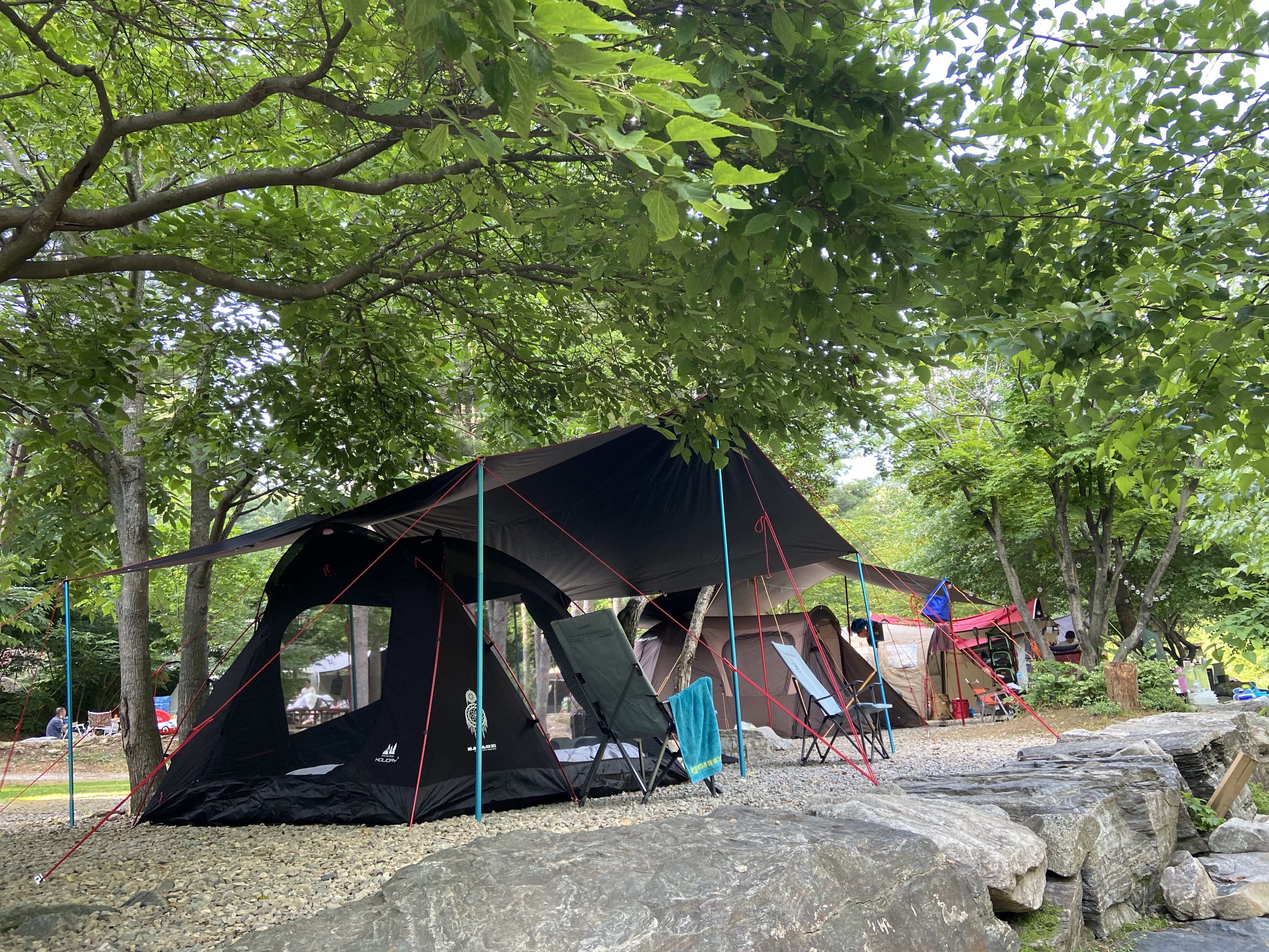 도착하자마자 남은 한자리로 안내해주셨는데 내가 좋아하는 계곡이 앞에 있는 자리였다. 남은 한자리가 계곡 자리라 다행이라 생각했다. 오는 중간에 비가 와서 타프부터 빨리 치였는데 나무로 둘러싸여 시원하지만 자리를 어떻게 만들지 구상이 필요했다.