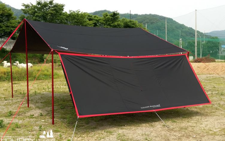 두 번째 방안은 타프 양옆에 막을 수있는 사이드월을 구매하는것이다. 사이드월을 이용하면 양옆에서 치고들어오는 비는 막을수 있다. 하지만 타프에서 연결하는 부위 틈새나 프런트에서 들어오는 비는 조금 젖을 것이다. 사이드 월도 요즘 구하기 힘든 건 마찬가지였다.