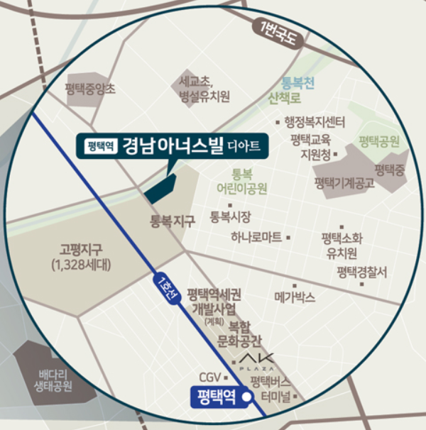 전철 1호선 라인을 따라 내려가다 보면 평택시가 있다. 여기 평택시는 산업단지가 많은데 통복지구에서 분양했던 경남아너스빌 디아트를 살펴보자. 공급 위치는 경기도 평택시 통복지구 도시개발사업구역 내 B-1BL이며 공급규모는 특별공급 250세대 일반공급 249세대 총 499세대이고 입주시기는 2025년 3월 예정이다. 통복지구 옆 고평지구가 1,328세대가 들어설 예정이라 합치면 약 1800세대 아파트 단지가 형성될 것으로 보인다.