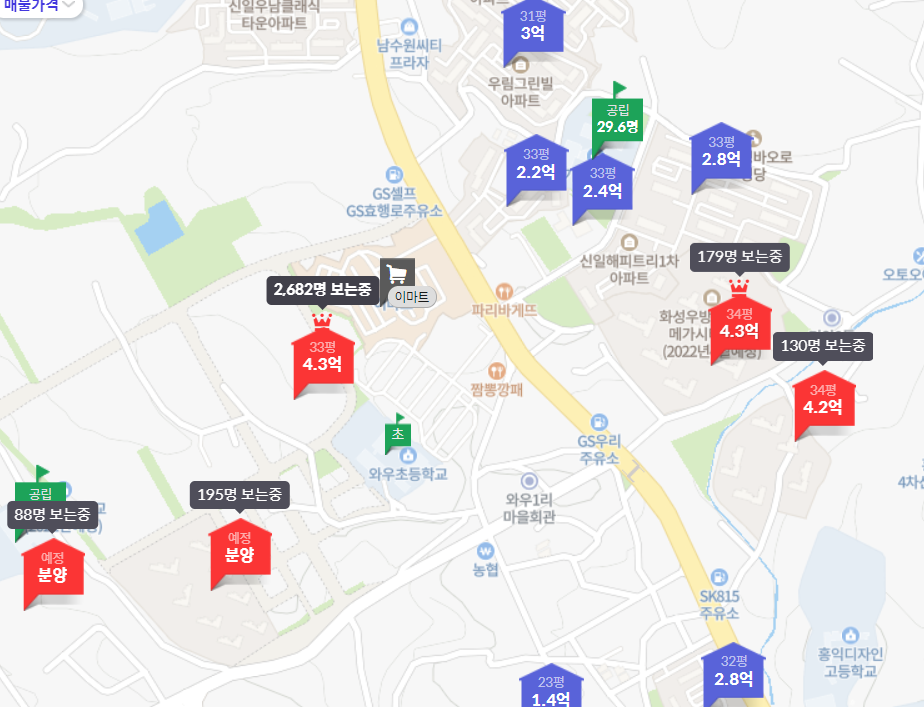 봉담자이라피네 분양가는 59형 3.3억 84형 4.3억 101형 5.1억 109형 7.3억으로 평형대가 다양하다. 주변시세로 10~20년 차 정도인 구축은 30평대 2억 중후반으로 형성되어있고 22년 4월 입주예정인 화성아이유쉘 메가시티 1차 2차 분양권 거래가가 84형 4.2억으로 형성되어있다. 주변 단지 구축 아파트에 비해서 가격이 높은 편이고 신축 아파트 가격대와 비슷한 정도 수준이다. 바로 옆 봉담 파라곤도 청약 예정이라 실거주하실 분들은 비교해서 보고 있다. 고민해보고 청약한다면 다음 주 월요일 24일 특별공급부터 시작하니 준비해 보자.