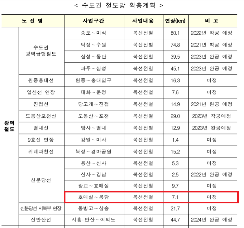 대중교통에 대한 기대는 현재 수원 강남에서 광교까지 개통되어있는 신분당선 연장이다. 호매실을 거쳐서 봉담까지 거론되고 있어서 가능성이 있는지 확인해보니 20년 12월 30일 국토교통부에서 제4차 수도권정비계획으로 발표한 내용 중 수도권 철도망 확충계획에서 호매실~봉담 연장이 있었으나 아직 공사 예정일은 없었다. 봉담역 위치는 현재 정해지지 않았다. 이제 계획안만 내놓은 상태라서 역이 생기려면 시간이 오래 걸리는 사안이다. 그러므로 현재 신분당선 영향은 크지않다.